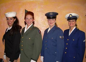 | "On behalf of the Ambassadors of Oak Run we wish to express our sincere appreciation and a great big thank you for presenting "USO Celebrity Camp Show Revue". We had a full house of 629 people and they were impressed with the singing and dancing talent. Bonnie, you were a delight to behold and you have a magnificent singing voice and personality plus". Pat Bartlett, Ambassador Chairman "On behalf of the Department of World War II Commemoration Committee and our very special war veterans, I would like to thank you for your performance. Your tribute to the Andrew Sisters was exactly the type of musical salute to veterans that we wanted to make our post-ceremony show a success. I was thrilled and touched watching the veterans as they listened to you. Some of them were inspired to get up and dance, while others were deeply moved by the memories you brought back to them". Jack Dunphy, Lieutenant Commander, US Coast GuardTampa - Dept. of the Army |
