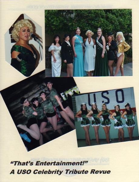| Vintage USO-Style Revue An exciting revue in the style of the USO Celebrity Camp Shows of the 1940's and 50's includes tribute appearances (as available) by The Andrew Sisters, Marilyn Monroe, Judy Garland, Frances Langford, Betty Grable, Marlene Dietrich, And a line of fabulous "Rockette style" dancers! |